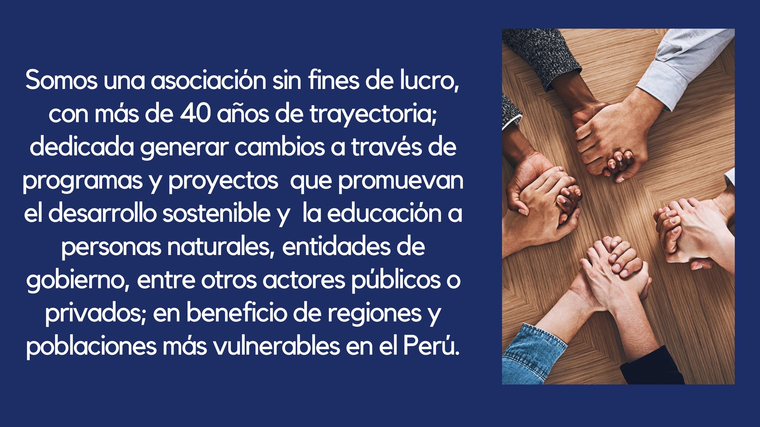 Promover la educación como motor de mejora de las condiciones de vida y desarrollo de capacidades en entidades públicas, sociedad civil y comunidades; para fortalecer sus conocimientos y lograr sus propios objetivos de desarrollo; además de compartir experiencias técnicas, buenas prácticas e innovadoras, lecciones aprendidas, herramientas, promover la participación social con cooperantes locales e internacionales.